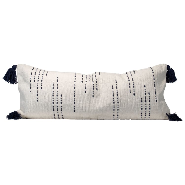 Add a touch of global-inspired style to your living space with our Ravi Pillows. Handcrafted by skilled artisans in India, these pillows feature a unique woven design with thick contrasting yarns for added texture. The natural cotton base is accented with a blue dash and dot pattern, creating a visually appealing look. The long lumbar shape is perfect for adding extra comfort to your sofa or bed, while the four large corner tassels add a playful touch. Made with high-quality materials, these pillows are as durable as they are stylish. Add a pop of color and texture to your home decor with our Ravi Pillows.