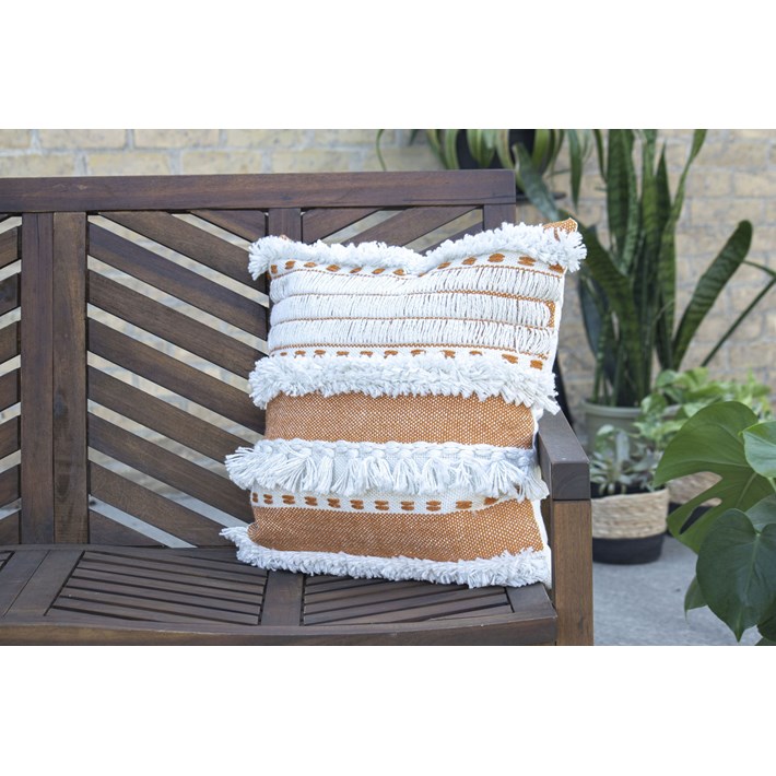 Add a touch of bohemian flair to your home decor with this beautifully colored pillow from Foreside Home & Garden. The woven white stripes and tufted yarns create a unique texture, while the rust orange color adds a vibrant pop to any space. Made of recycled PET plastic, this pillow is not only stylish but also eco-friendly. Hand woven by artisans in India, this pillow is of the highest quality and is suitable for both indoor and outdoor use. Rest comfortably and stylishly with this transitional piece that will elevate any room in your home.