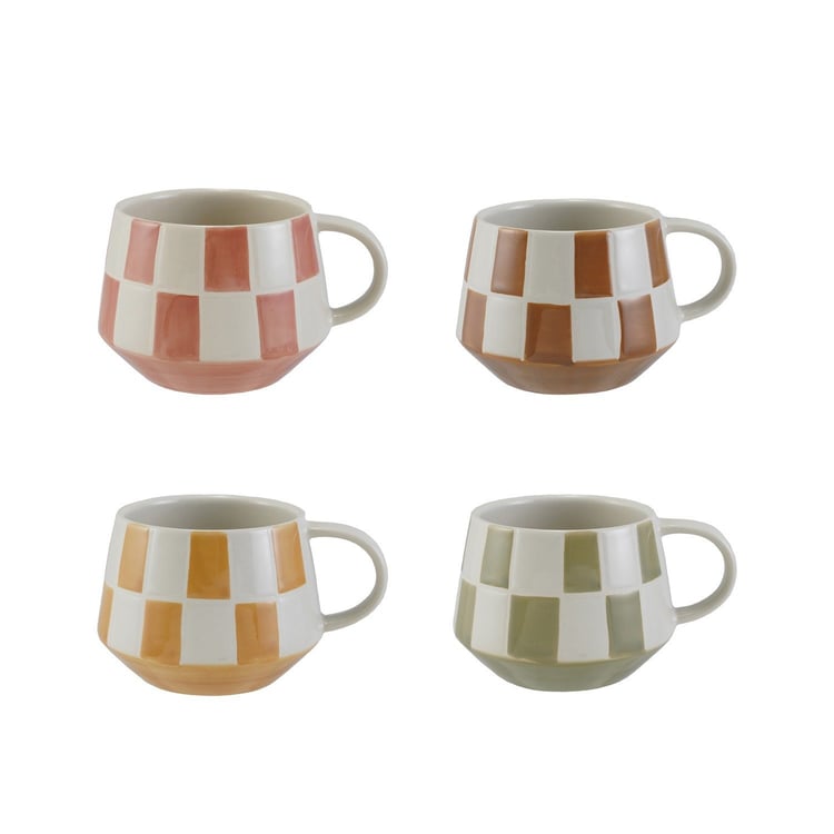 Description: 3-1/4" Round x 3-1/4"H 10 oz. Hand-Painted Stoneware Mug w/ Check Pattern in HMâ„¢ Box, 4 Colors, Microwave, Dishwasher Safe