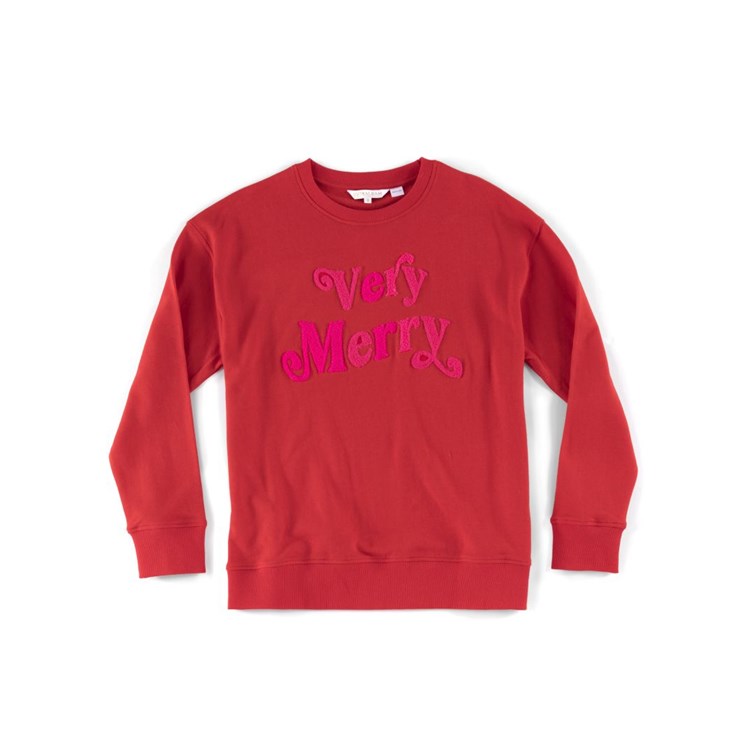 Creatures of comfort, rejoice! Whether you’re working from home or enjoying your Sunday slumber this holiday season, you will appreciate the collection of pieces from Shiraleah that make you feel good. The red colored "Very Merry" Sweatshirt is made of lightweight cotton blend and the ultimate lounge piece. It also has multi colored text in bolded sherpa lettering. The classic round neck, banded cuffs and hem allow this sweatshirt to have the perfect fit.