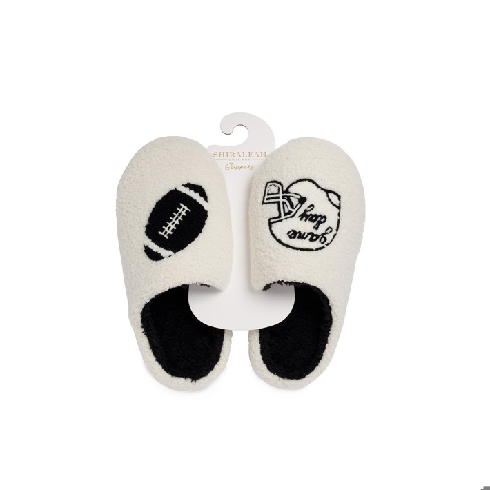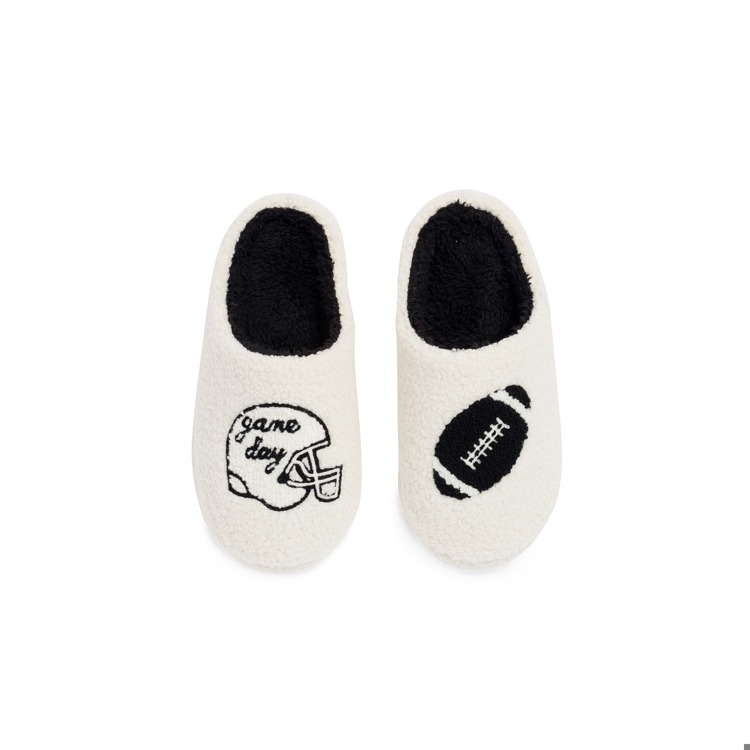 Get cozy and game-day ready with our Helmet "Game Day" Slippers! These ultra-soft ivory slippers are lined with plush black sherpa and feature playful football-themed embroidery—one with a football and the other with a helmet that says “Game Day.” With a slip-on design and a snug fit, they’re the perfect pick for lounging on the couch or cheering from the sidelines at home. Whether you're catching kickoff or just running for a snack refill, your feet will stay toasty and spirited. Made from polyester and TPR.