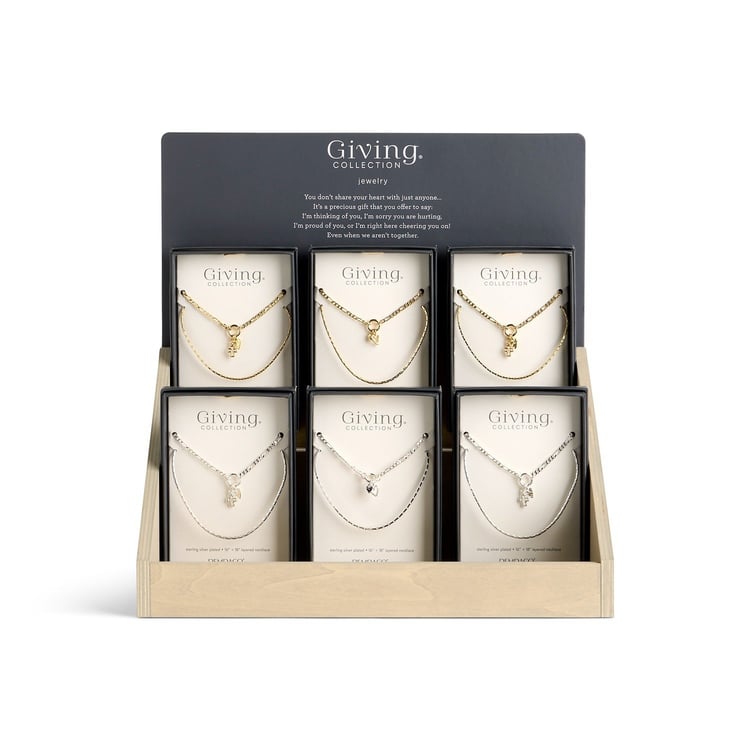Includes: 1004440402 Giving Toggle Jewelry POP Sign 1004440375 Double Heart Gold Charm Layered Necklace 1004440377 DoubleHeartSilverCharm LayeredNecklace 1004440376 Heart+CrossGoldCharm Layered Necklace 1004440378 Heart+CrossSilverCharm LayeredNecklace 1000900049 13W_2T_GryWoodDisplayer