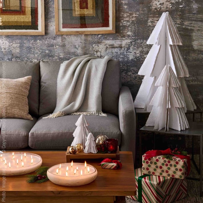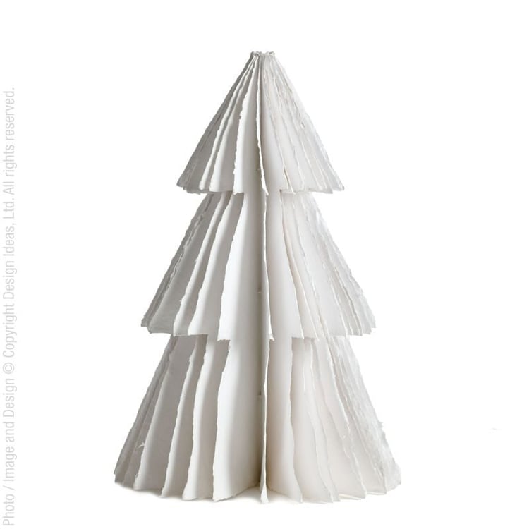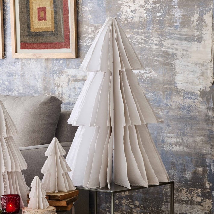 We take handmade paper and rough cut the edges to form these impressive room decorations. The paper has a high cotton content which lends it a quality hand and heft that you feel as the tree unfolds. Best of all, after the holidays each tree folds flat for easy storage. If children or grandchildren feel inspired to color on these quality pages you might end up with a decoration you will treasure forever. Care: Clean with soft and dry cloth Material: Cotton Paper