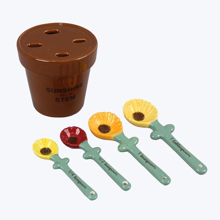 Add a touch of sunshine to your kitchen with this delightful sunflower-themed measuring spoon set. The set includes four measuring spoons in different sizes, each adorned with a vibrant floral design. The matching holder keeps the spoons organized and easily accessible. Not only are these spoons practical for baking and cooking, but they also make a charming decorative accent for your kitchen. Brighten up your culinary space with this cheerful and functional set.