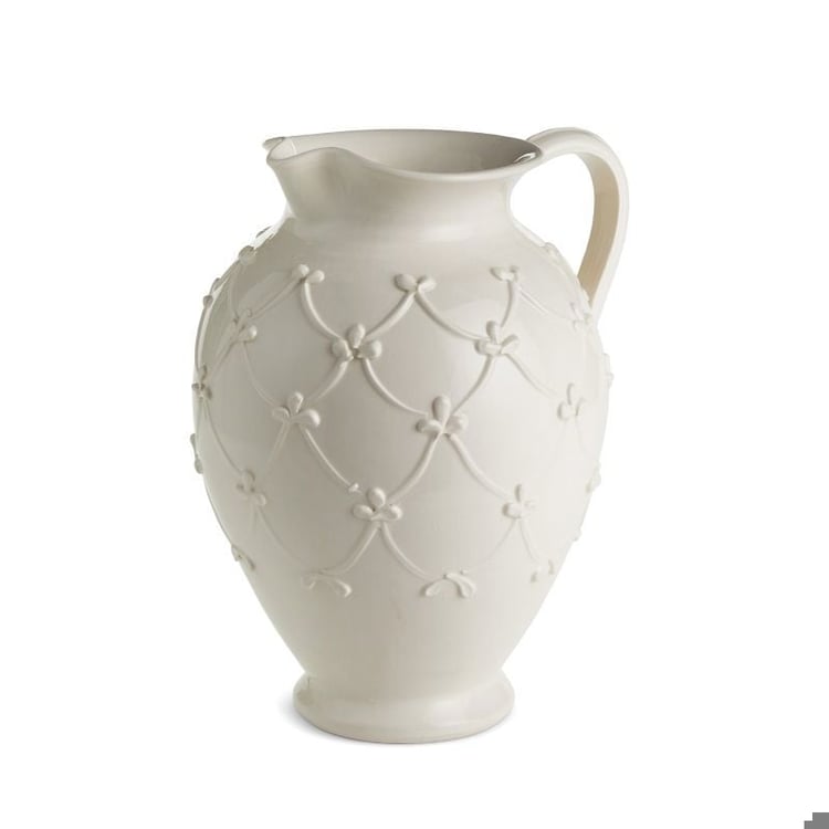 This handcrafted lattice adorned decorative pitcher from Tuscany, Italy is a true original, made with classic Italian craftsmanship passed down through generations. The warm, glossy white glaze adds a neutral touch, making it the perfect accent for any feature table, entry console, or bookshelf. Each piece is unique in size and color, crafted by skilled artisans. To maintain its beauty, simply dust with a dry cloth and line the interior when necessary to protect fine furniture. This piece is for decorative interior use only, adding a touch of Italian elegance to any space.