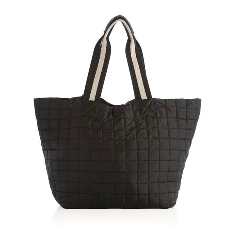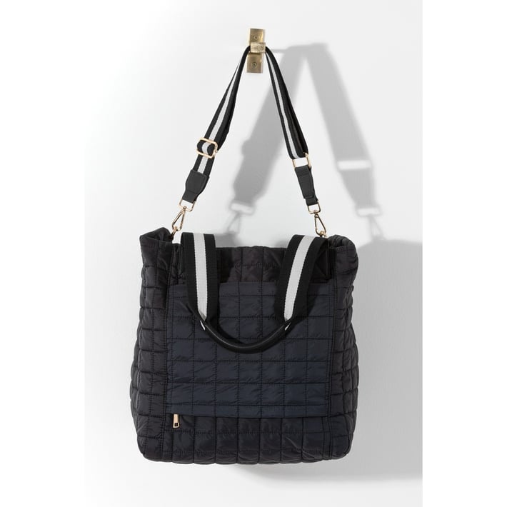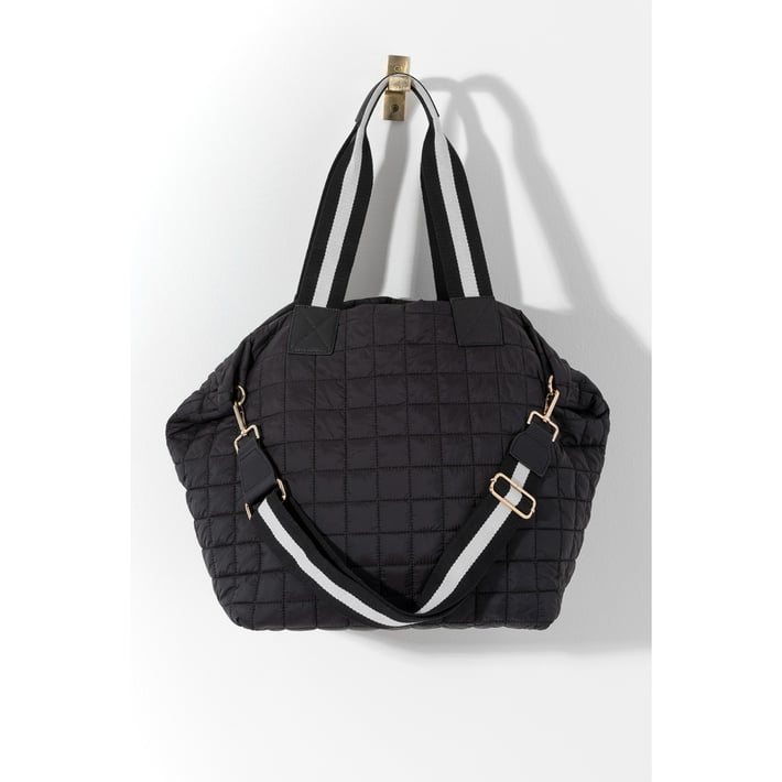 nylon; gold hardware; double handles; detachable, adjustable cross-body strap; top zip closure; 1 outer trolley sleeve, 2 outer zip pockets, 1 inner zip pocket, 2 inner slip pockets