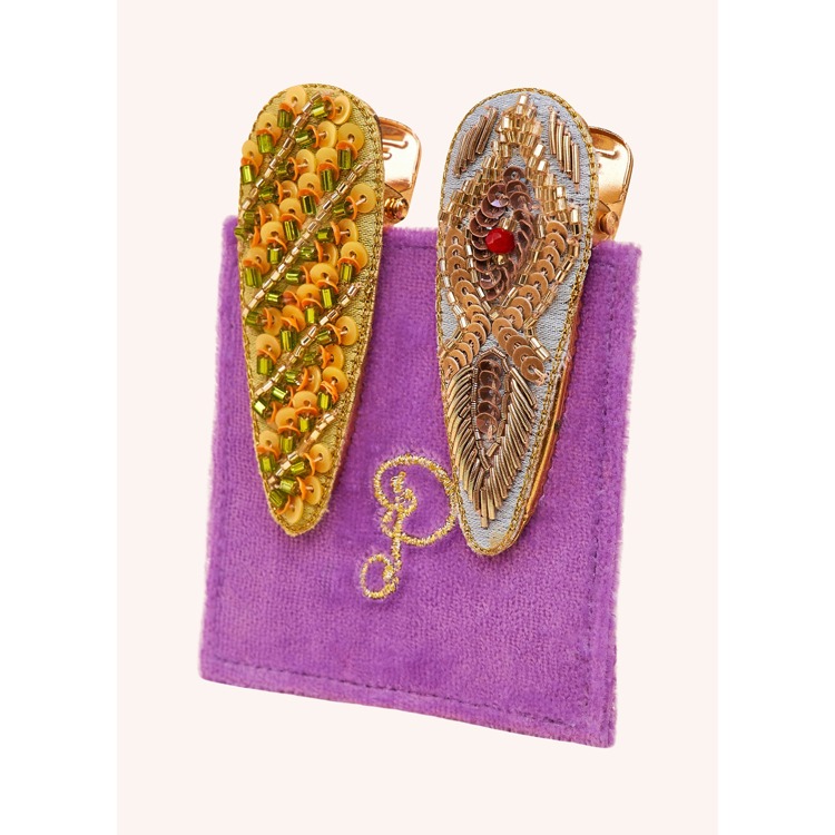 Groovy and glam! This is where exceptional design meets 60s dreaming. These feather and stripe hair clips are the perfect gift for any free spirit in your life. Elevate styling from day to night effortlessly with these exquisite handmade hairclips. Comes with our iconic mini gift bag and on a velvet card for the most thoughtful gift for someone or treat for yourself. Fabric: 100% polyester velvet / Shell: metal