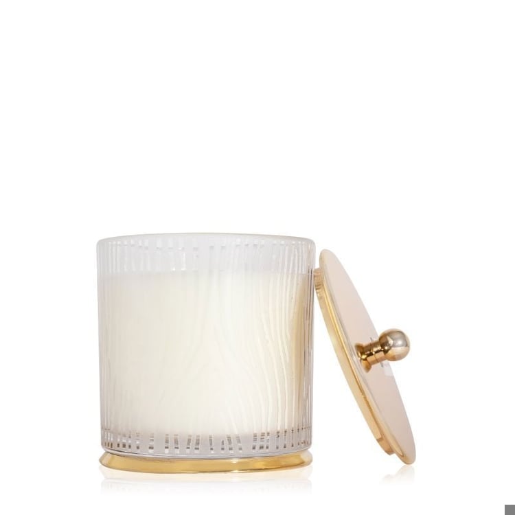 Elevate the ambiance of your living space with the elegant Frosted Wood Grain Large Poured Candle. This luxurious candle boasts a frosted wood grain design, a chic gold lid, and a gold-edged base for a touch of sophistication. Infuse your home with the inviting scent of Frasier Fir, reminiscent of a freshly cut forest. The warm glow of this candle will create a cozy atmosphere, perfect for relaxing or entertaining. Add a touch of glamour to any room with this exquisite candle.