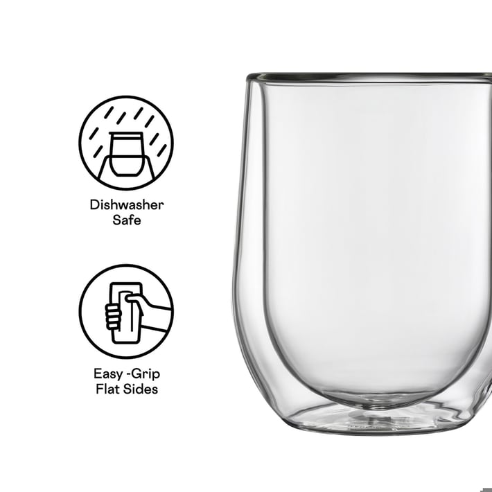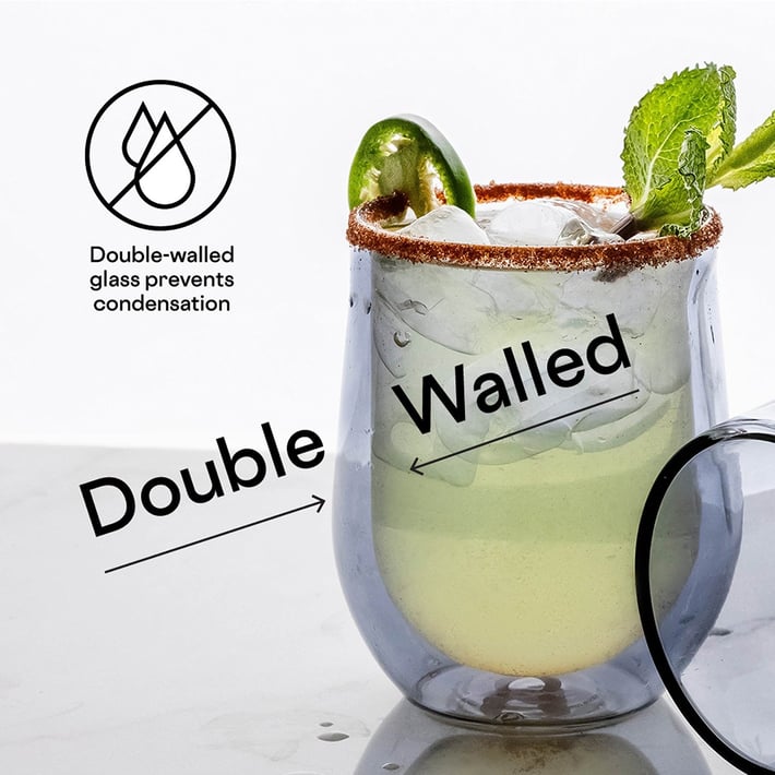 Elevate your drinking experience with this stylish and functional stemless glass set. Made from high-quality double-walled glass, these glasses are perfect for both hot and cold beverages. The sleek design adds a touch of elegance to any bar cart or table setting. Whether you're enjoying a glass of wine or a refreshing cocktail, these glasses are sure to impress. Packaged in a beautiful gift box, they make the perfect present for any occasion. Cheers to the coolest stemless set ever!