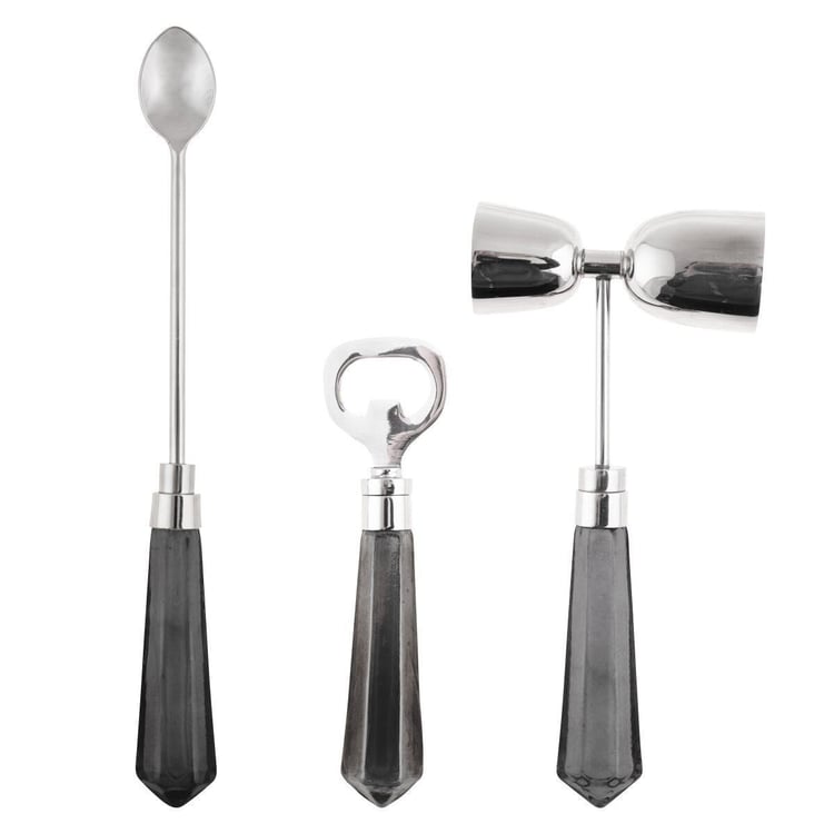 Our Harper Bar Tools set is the perfect addition to any home bar. This set includes a long-neck stirring spoon, bottle opener, and duel-sided jigger, all made with glass handles and stainless steel for a classic and durable look. Mix up your favorite cocktails to unwind after a long day or to celebrate with loved ones. Start building your collection of cocktail basics with these essential tools. Cheers to good times ahead!
