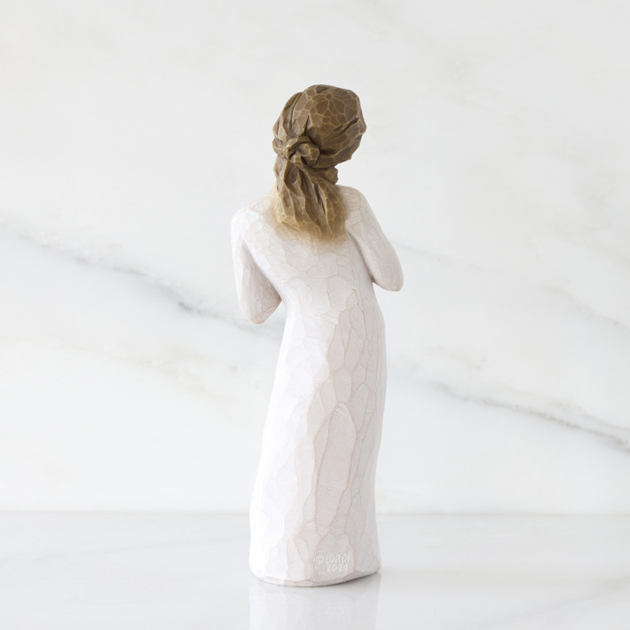 A figure with hands to heart and a comforting, quiet presence. A tangible symbol of connection and support representing empathy towards someone experiencing loss or hardship; a reminder of those who are thinking of you and wishing the best for you