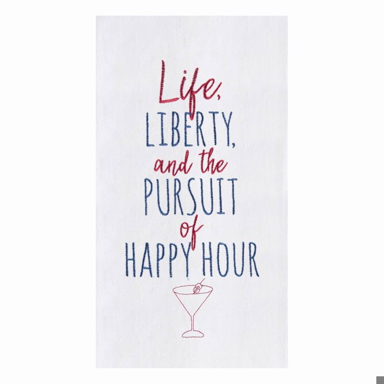 Celebrate the pursuit of happiness with this charming flour sack towel, featuring a playful design that captures the essence of happy hour and American pride. Made of soft and absorbent cotton, this towel is not only a practical addition to any kitchen, but also a fun and festive decoration for Independence Day. Whether you're drying dishes or getting ready for a backyard BBQ, this towel is sure to bring a smile to your face and add a touch of patriotic flair to your home. Perfect for gifting or keeping for yourself, this towel is a must-have for anyone who loves to celebrate life, liberty, and the pursuit of happiness.