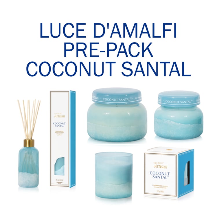 Indulge in the luxurious scents of the Amalfi coast with this Artisan Luce d'Amalfi Pre-pack. This set includes a case pack of four different products, each infused with the exotic fragrance of Coconut Santal. The 19oz Signature Candle will fill your home with a warm and inviting aroma, while the 8oz Petite Candle is perfect for smaller spaces. The 8oz Boxed Tumbler adds a touch of elegance to any room, and the 8oz Diffuser will keep your space smelling fresh all day long. Treat yourself to the essence of the Amalfi coast with this exquisite pre-pack.