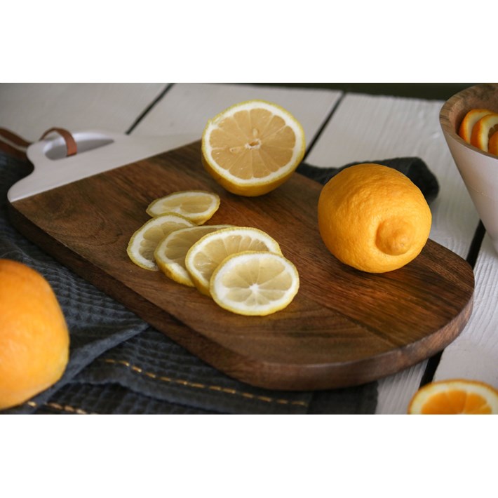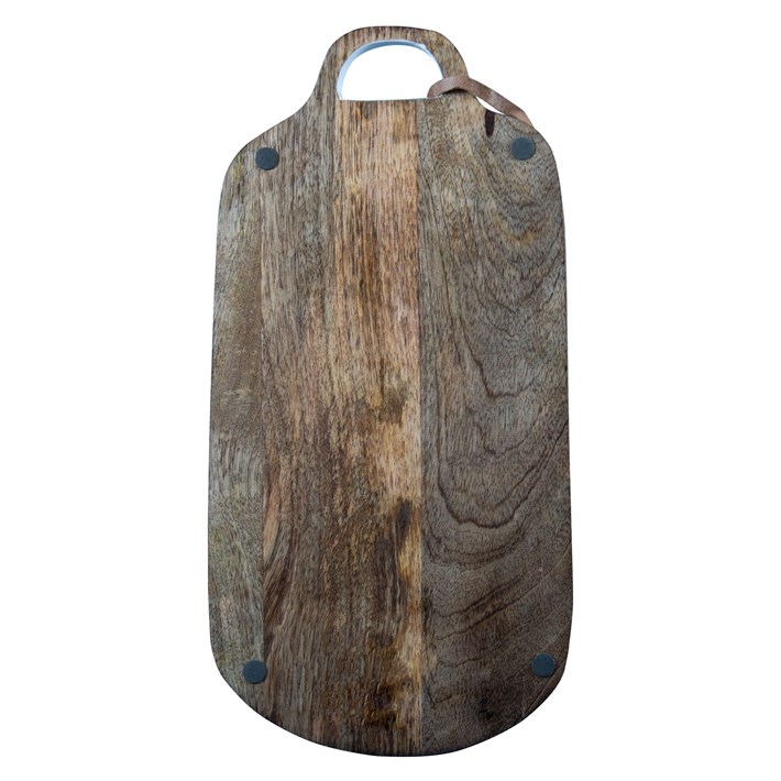 This cutting board is not just a practical kitchen tool, but also a stunning piece of decor that will elevate the look of your kitchen. The combination of mango wood and white enamel paint creates a unique and stylish aesthetic that will complement any style of kitchen. The leather tie hanger adds a touch of elegance and makes it easy to hang up when not in use. Whether you're using it to prepare food or as a serving platter, this cutting board is sure to impress your guests and add a touch of sophistication to your kitchen.