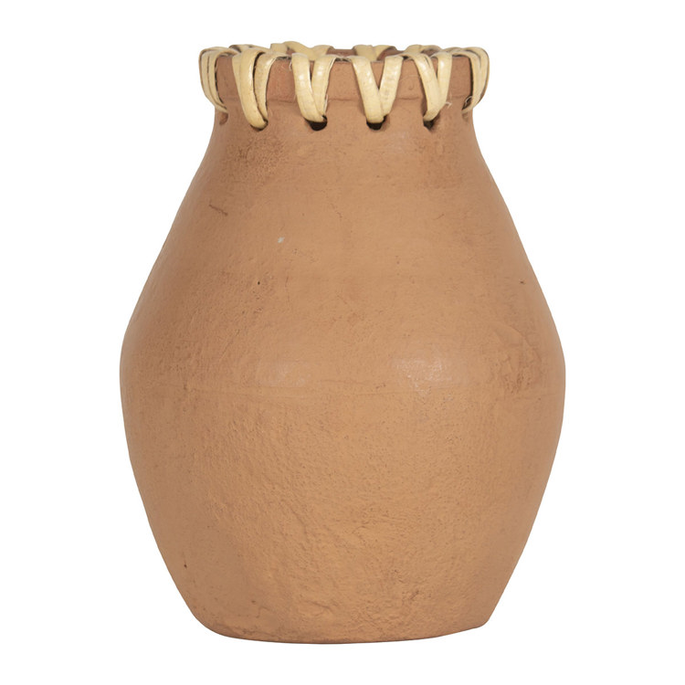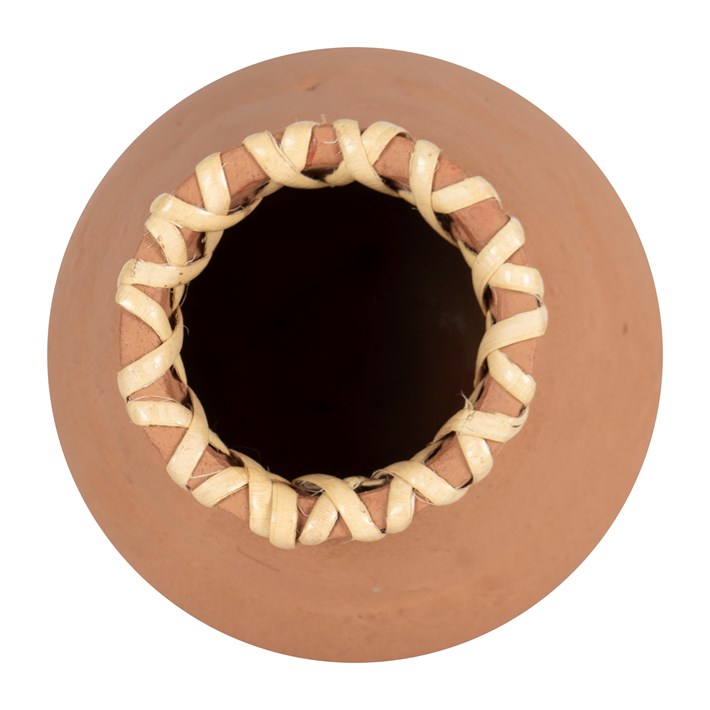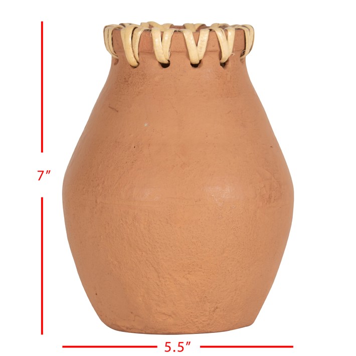 Add a touch of bohemian charm to your home with this handcrafted terracotta vase accented with woven rattan. Perfect for displaying dried grasses or faux stems, this unique piece is sure to make a statement in any room. Each vase is one-of-a-kind, showcasing the skill and artistry of the artisans who created it. Bring a touch of natural beauty into your space with this stunning vase.
