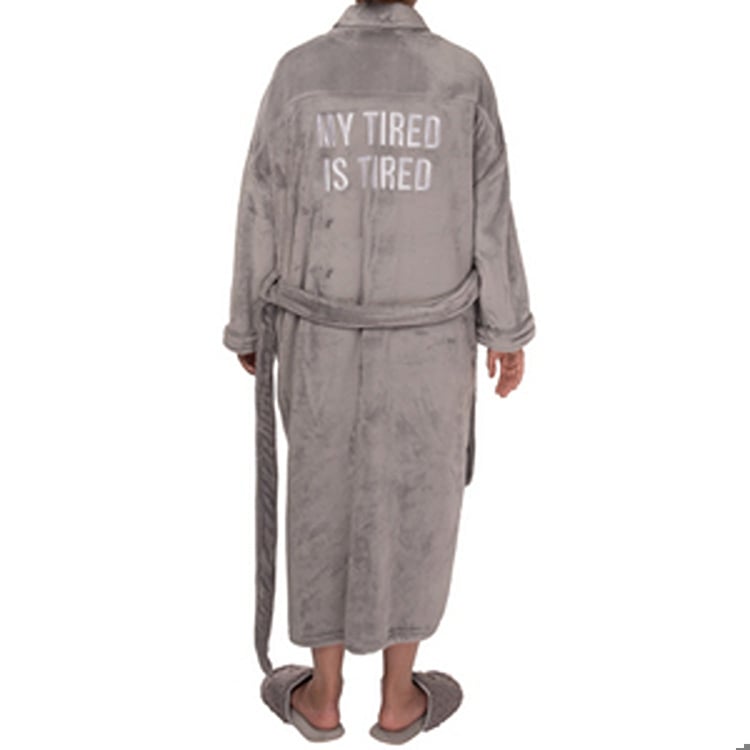 Made from ultra-soft and plush material, our My Tired Is Tired Robe is designed for maximum comfort and relaxation. The luxurious fabric will make you feel like you're wrapped in a cloud, perfect for lounging around the house or enjoying a lazy day in bed. The robe features a stylish design with a tie waist and pockets, making it both practical and chic. Pair it with the matching slippers for a complete loungewear look that will have you feeling cozy and stylish all day long. Treat yourself or a loved one to the gift of relaxation with our My Tired Is Tired Robe.