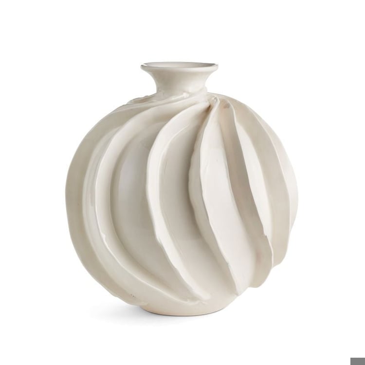 The Ondulata Vase is a stunning piece with a high-relief pattern of undulating waves hand-applied around the entire vase. Made with classic Italian craftsmanship, each vase is a unique original created by skilled artisans. This grand scale vase is perfect as a dynamic centerpiece for a feature table, kitchen island, or mantel. Handmade in Italy, the vase is white in color and should be dusted with a dry cloth for maintenance. Protect your furniture by lining the interior of the vase when necessary. This decorative piece is for interior use only and adds a touch of elegance to any space.