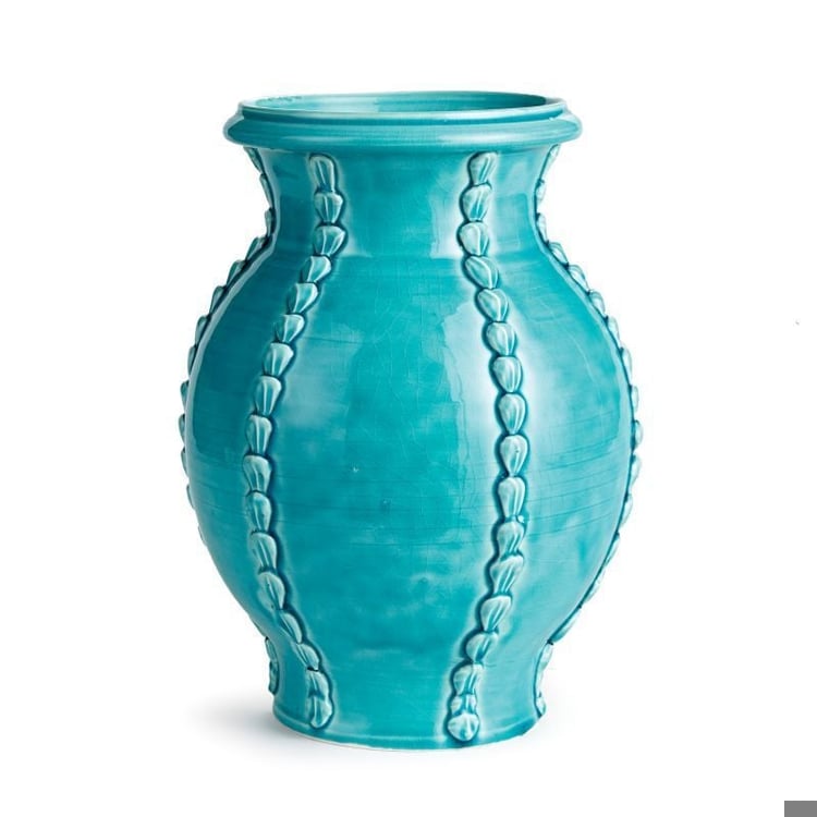 The Positano Vase is a stunning piece handmade by Italian artisans in Tuscany, Italy, showcasing classic Italian craftsmanship passed down through generations. Each vase is a unique original, with a hand-applied shell form in a linear pattern for a traditional look. Crafted by skilled artisans, each piece varies in size and color, adding to its charm. To maintain its beauty, simply dust with a dry cloth and line the interior when needed to protect fine furniture. This aqua vase is perfect for decorative interior use only, adding a touch of Italian elegance to any space. Handmade in Italy, this vase is a true work of art.