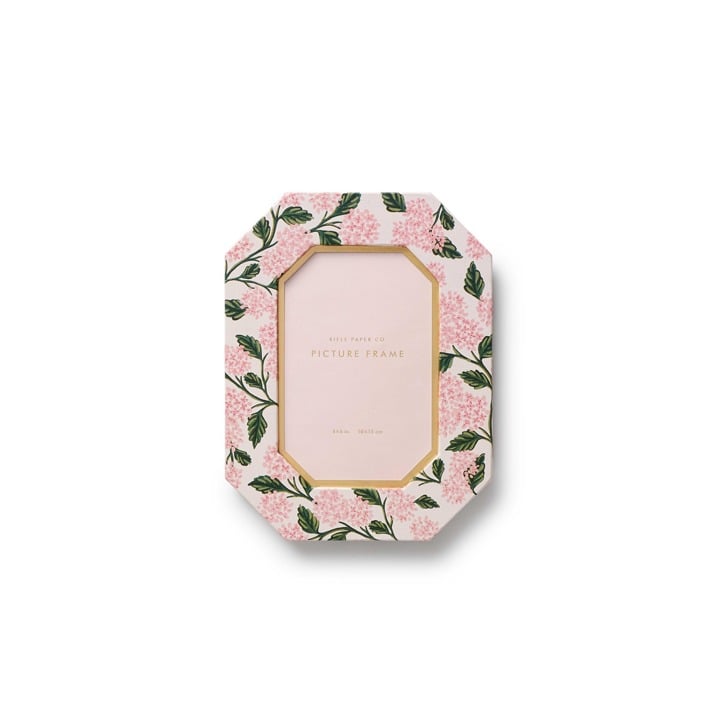 Sized for a 4x6 photo, this octagonal, paper-wrapped frame features illustrated hydrangeas, a metallic gold photo mat, and a kickstand for display.