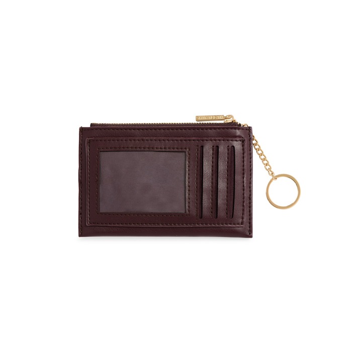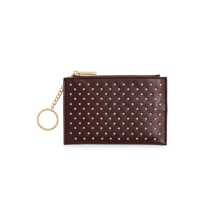 studded pu; gold hardware; keychain; top zip closure; 2 credit card slots