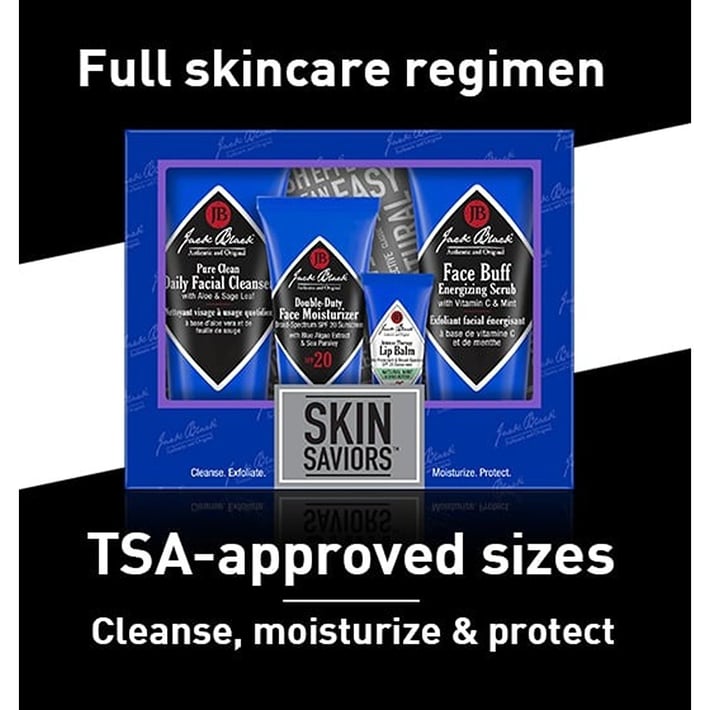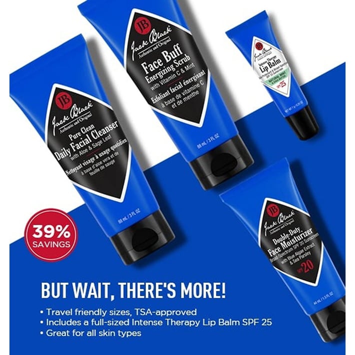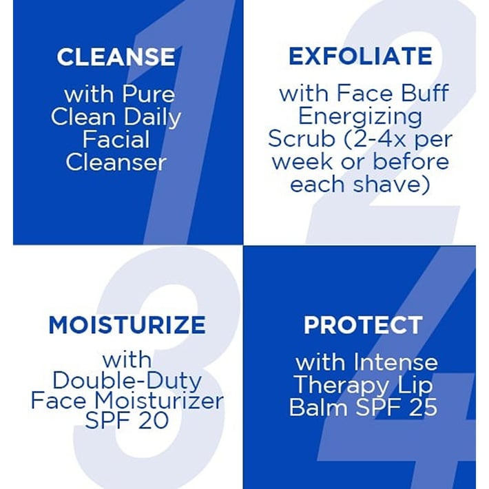 Pure Clean Daily Facial Cleanser, 3 oz.A 2-in-1 liquid cleanser and toner that removes deep-down dirt and oil for clear, smooth, shave-ready skin.Face Buff Energizing Scrub, 3 oz.A pre-shave cleanser and facial scrub in one that gently exfoliates for an easier, closer shave.Double-Duty Face Moisturizer SPF 20, 1.5 oz.This lightweight, emollient moisturizer is an advanced facial treatment and broad-spectrum sunscreen in one easy-to-use product.Intense Therapy Lip Balm SPF 25, Natural Mint & Shea