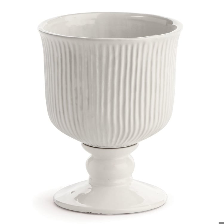 The traditional shape and ribbed design of this white pot give it a classic feel that will complement any decor. Whether you use it as a cachepot or plant directly into it, this versatile piece is sure to make a beautiful centerpiece. To protect your furniture, consider lining the interior of the pot. While this pot does not have a drain hole, it is designed to fit the top-selling drop-ins for easy pairing. Remember to protect it from frost and hard freezes if using outdoors. Add your favorite flowers to create a stunning display that will brighten up any space.