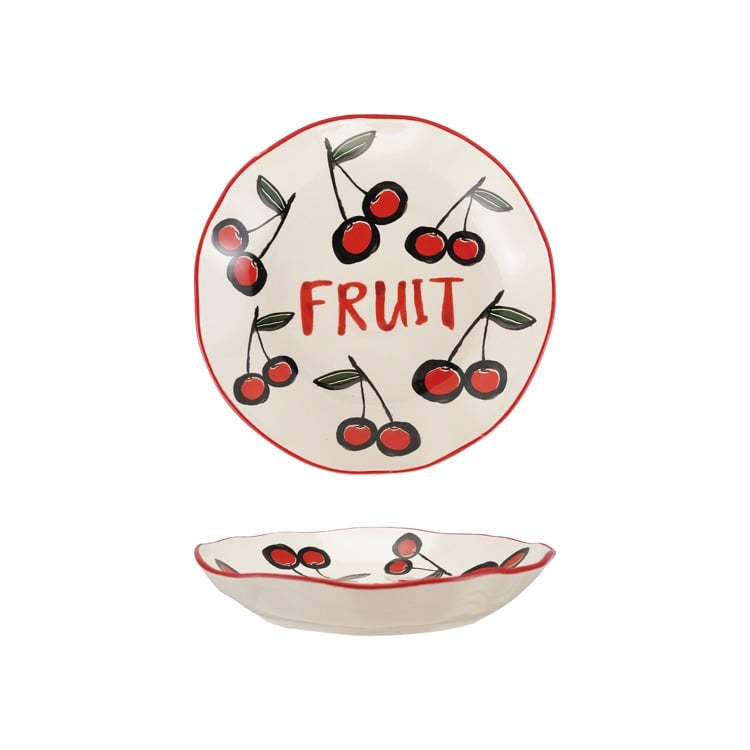 10" Round x 2"H Stoneware Organic Shaped Low Bowl w/ Colored Rim & Cherries "Fruit", Multi Color ©, Microwave, Dishwasher Safe