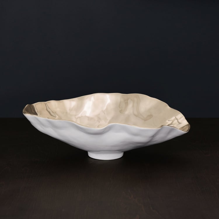 Designed to delight, our THANNI Maia Large Oval Bowl (White) is stunning, luxe, and drop dead gorgeous. Its sculptural shape was crafted to add wow to any tabletop and combines a white enamel color surface with brilliant gold. The THANNI pieces are simply spectacular and are as beautiful as they are practical. This handsome large-scale piece makes a dramatic statement wherever it is placed.