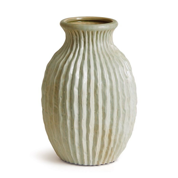 The Thessaly Vase in soft sage glaze is a stunning accent piece that exudes understated beauty. Handcrafted by skilled artisans, each vase is unique in size and color, making it a one-of-a-kind addition to any space. The subtle green hue adds a touch of elegance to any room, while the artisan's touch gives it a special charm. To maintain its beauty, simply dust with a dry cloth and line the interior when necessary to protect your furniture. Add a touch of sophistication to your home with the Thessaly Vase in soft green.