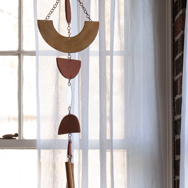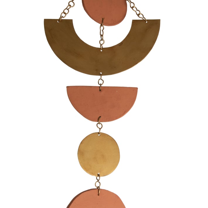 Add a touch of bohemian charm to your living space with the Terracotta Geo Wall Hanging. This unique piece features handcrafted terracotta shapes mixed with antiqued brass accents and decorative bells, creating a stunning cascading design. The warm golden and terracotta hues bring a sense of warmth and brightness to any room. Made from high-quality terracotta and metal, this wall hanging is both durable and stylish, making it the perfect addition to your home decor.
