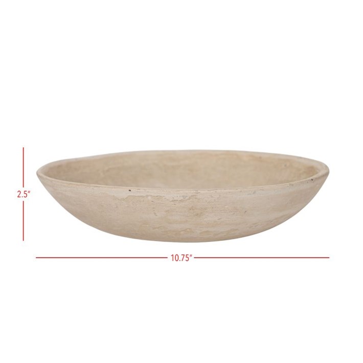 This paper mache decorative bowl is a unique and eco-friendly addition to your home decor. Handcrafted from recycled paper products using a traditional pulp method, this bowl has a substantial weight and durability similar to porcelain. Its neutral off-white color makes it a versatile piece that can be used to hold decorative balls, fillers, or organize small items on your coffee table or shelves. The rustic charm of this bowl will add a touch of warmth and character to any room in your home.