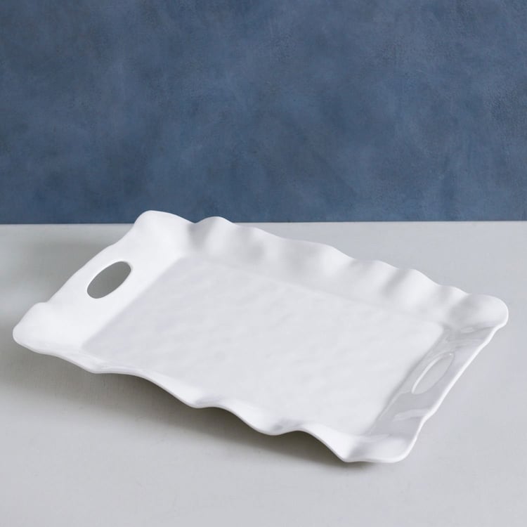 An ample serving area and notched handles make this White Rectangular Tray a shining star in our innovative Havana Collection, a luxury melamine line designed with distinctive Beatriz Ball flair.Fabulous for passing around snacks or drinks, the tray also makes a statement perched on the bar or kitchen island. Perfectly suited for indoor and outdoor entertainment, this Havana tray is designed for everyday enjoyment.