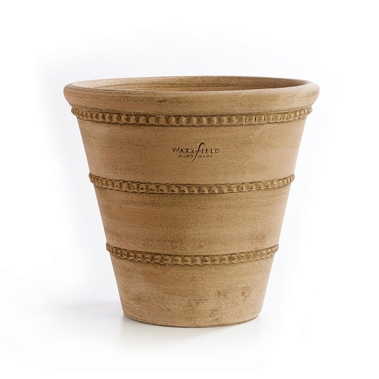 The Oldham planter, designed by master potter Peter Wakefield, is a unique and exclusive piece handmade in Honduras. Its simple tapered shape and triple beaded detail add a touch of elegance to any space. Made from aged terracotta, this planter can be used as a cachepot or for planting directly into. To protect your furniture, consider lining the interior of the pot. It is important to protect the planter from frost and freezing conditions. With a drain hole for proper drainage, the Oldham planter is both functional and stylish, making it a perfect addition to your home or garden.