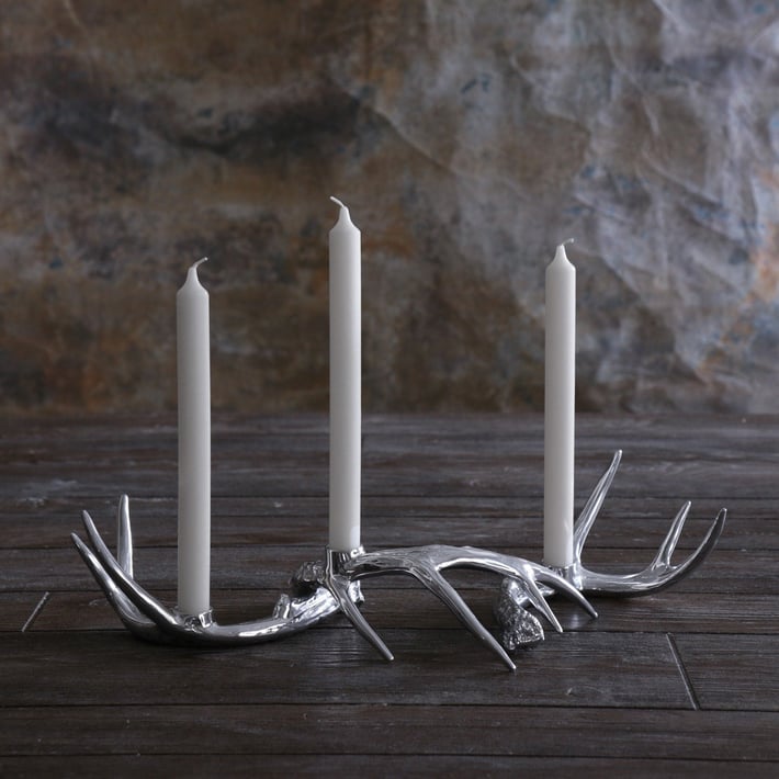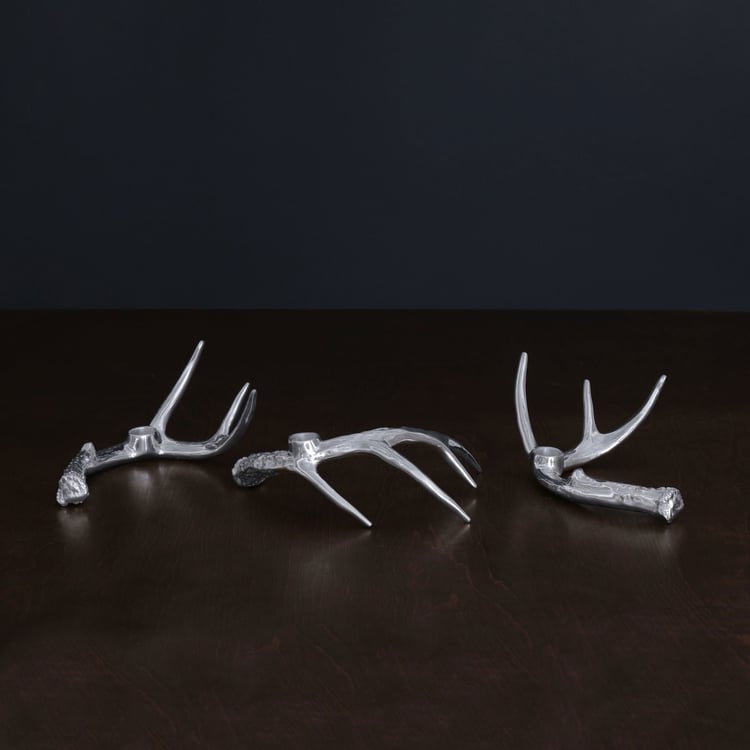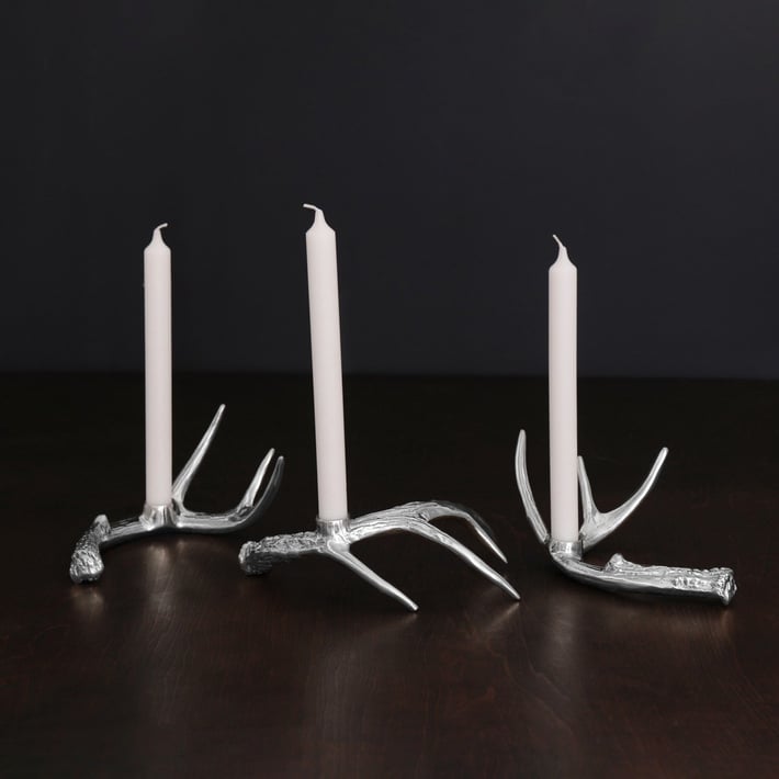 Description: Think of it as interactive art... Crafted by skilled artisans in our signature metal, the WESTERN Antler Candlestick Gold Set of 3 really pushes the limits of the art of sand-casting. The innovative designs are characterized by elegant interlocking natural forms that incorporate a sense of expression and dynamic movement. Sinuous and supple, the trio of curving antler-inspired candle holders makes a sculptural statement wherever they are placed.