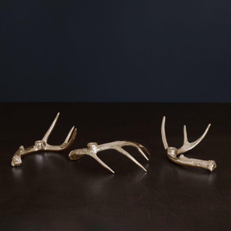 Gleaming and functional Western sculpture for the table. Crafted by skilled artisans in a proprietray gold-tone metal finish, the WESTERN Antler Candlestick Gold Set of 3 (Gold) pushes the limits of the art of sand-casting. The innovative designs are characterized by elegant interlocking natural forms that incorporate a sense of expression and dynamic movement. Sinuous and supple, the trio of curving antler-inspired candle holders makes a sculptural statement wherever they are placed.