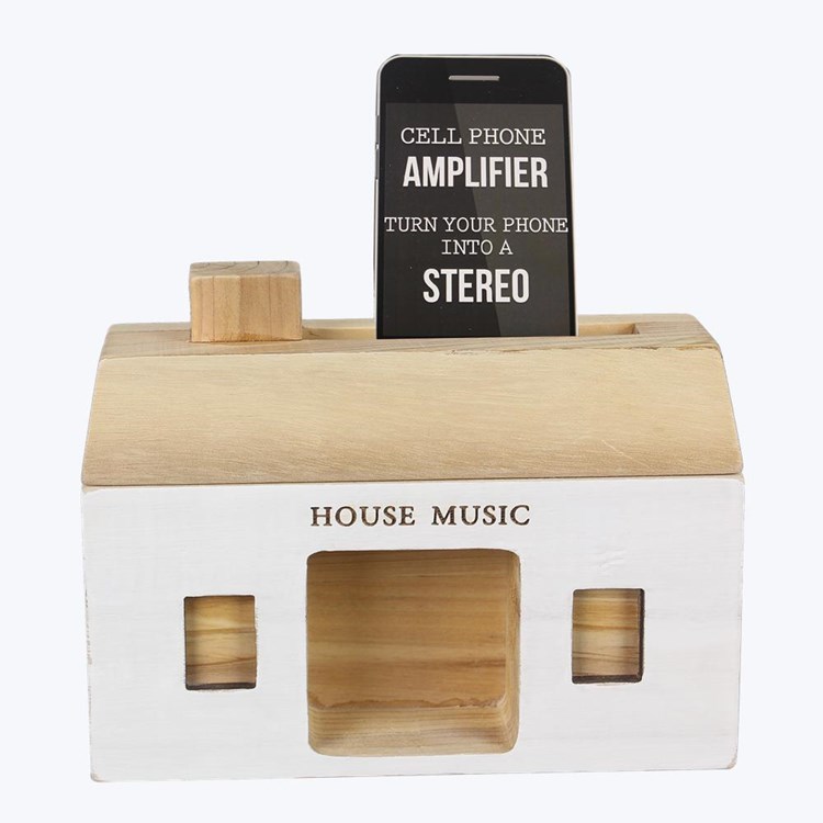 This wooden phone sound amplifier is designed in the shape of a house, adding a touch of minimalist and natural aesthetic to any room. The upper portion resembles a wooden roof, while the bottom features a white-painted facade with HOUSE MUSIC engraved on the front. It amplifies sound without the need for electronic components, making it both stylish and eco-friendly. Perfect for music lovers who appreciate unique and sustainable accessories.