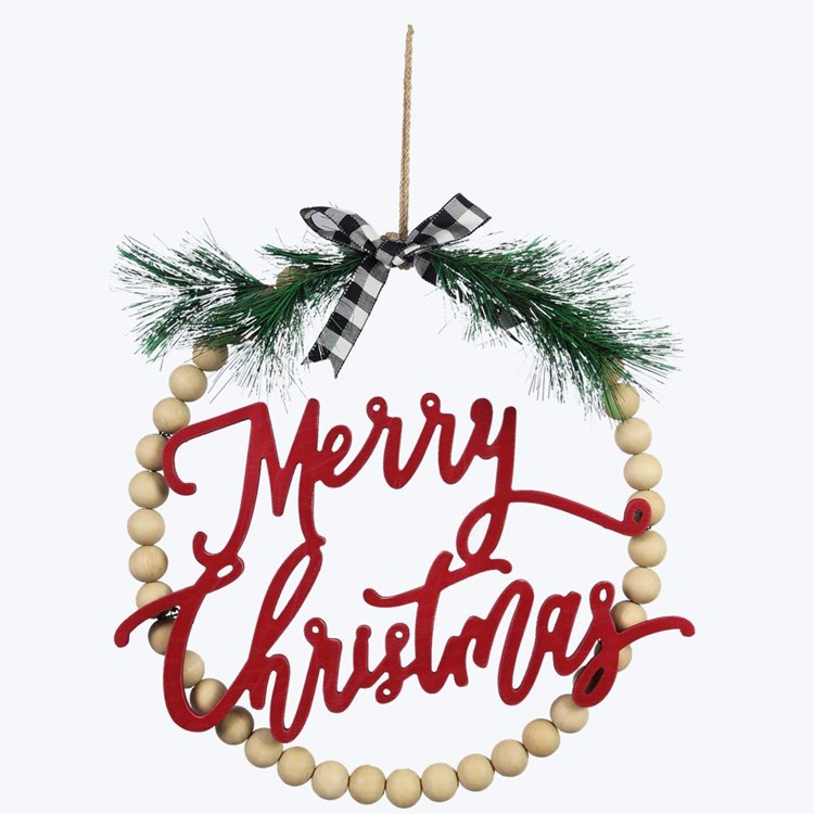 Welcome the holiday season with this beautifully crafted Merry Christmas wreath. Featuring natural wooden beads, a vibrant red Merry Christmas cutout, and festive greenery topped with a charming black-and-white plaid bow, this wreath adds a cozy farmhouse charm to any home. Perfect for doors, walls, or mantels, it brings warmth and joy to your holiday decor. This wreath is the perfect way to greet guests and spread holiday cheer throughout your home. Made with high-quality materials, it is durable and long-lasting, ensuring it can be enjoyed for many holiday seasons to come. Add a touch of festive flair to your home with this delightful Merry Christmas wreath.